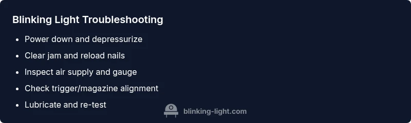 Most likely the blinking light on a craftsman 16 gauge finish nailer signals a safety interlock or power issue. Quick fixes: disconnect power (unplug or remove battery), clear any jam or nail misfeed, reseat the magazine and trigger, then reconnect power and test lightly. If the light persists, inspect air supply and consult the owner’s manual or service center. According to Blinking Light, start with the simplest causes first.