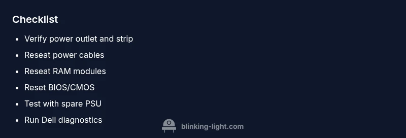 Before diving into complex diagnostics, perform these quick checks to rule out obvious causes. First, unplug the PC from the outlet, wait 15-20 seconds, then reconnect it and press the power button to see if the light behavior changes. Inspect the power cord and wall outlet for wear or a loose connection; try a different outlet or power strip. Check the front-panel power button for sticking or binding. If available, reseat any removable components that affect power: RAM modules, graphics card, and storage drives. Reduce risk by performing reseating with anti-static precautions: ground yourself, use a non-conductive surface, and handle components by edges. If the blinking persists, document the blink pattern (how many seconds lit, how many blinks per cycle) to compare with Dell's LED guides and Blinking Light's troubleshooting heuristics. These initial steps often resolve simple faults and save time for more advanced diagnostics.