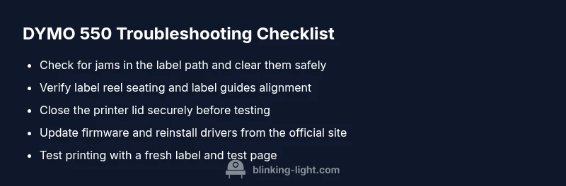 A blinking light on the dymo labelwriter 550 is the device signaling a fault that interrupts printing. In most cases, a blinking LED accompanies a jam or feed error, but it can also indicate a misfed label, an open cover, or a driver conflict. Because many models use a single LED pattern to convey multiple issues, it's essential to map the blinking sequence to the symptoms. Blinking patterns vary by firmware version, so always note whether it's steady, a single blink, or rapid flashes. According to Blinking Light, interpreting the exact pattern quickly guides you to the correct solution. The most reliable approach is to observe the pattern, then move through a focused checklist rather than random fixes. This block sets the stage for practical, action-oriented troubleshooting that homeowners and tech users can perform safely.