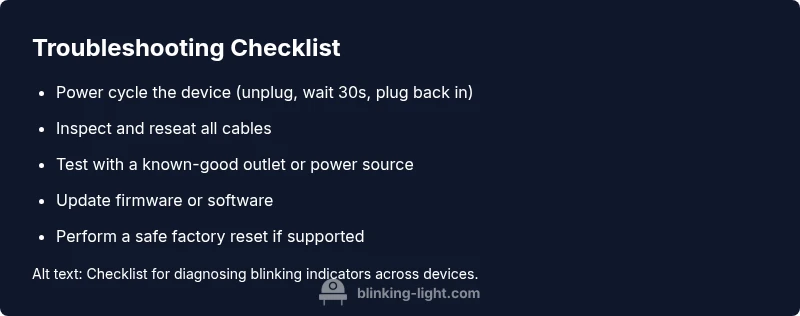 Here we provide device-specific checks to tackle the most frequent blinking patterns. For cars, verify dashboard fuses, battery voltage, and engine sensors; for appliances, inspect door seals, water sensors, and heating elements; for routers, confirm power supply stability, firmware status, and cable integrity; for smart devices, ensure the hub is online and that there are no conflicting apps. Begin with quick wins: reseat cables, restart devices, and reset network connections. If the light still blinks after these steps, advance to firmware updates or factory resets as appropriate for your device. Use a calm, methodical approach and document results to compare with later troubleshooting steps. If any step feels risky or requires specialized tools, proceed to professional help.