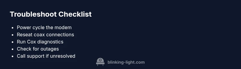 The green blinking light on a Cox modem signals that the device is attempting to establish or re-establish a connection. While some blinking patterns are harmless, others point to a temporary fault that can disrupt Wi-Fi, streaming, or smart home routines. The key is to treat a blinking green LED as a call to action: don’t wait for a total outage to escalate the issue. According to Blinking Light, understanding LED patterns helps homeowners act quickly and safely. The focus here is on diagnosing the common green blinking light cox modem scenario, with practical steps you can perform yourself before involving Cox support. Early checks save time and prevent unnecessary service calls.