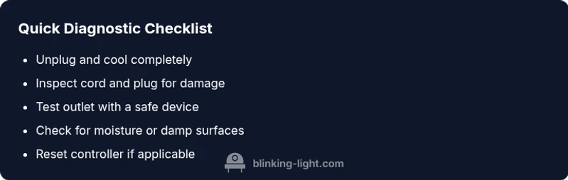 Blinking indicators often point to a few recurring issues. First, overheating is the most common culprit: blocked vents, folded material, or excessive power draw can cause the internal thermostat to trip. Second, a faulty controller or damaged power cord/outlet can mimic an overheat signal. Third, moisture ingress or exposure to water can trigger safety protections. Fourth, a worn or degraded temperature sensor may register incorrect readings. Finally, a poor-quality or incompatible power adapter can create fault signals. According to Blinking Light analysis, patterns of blinking can hint at which subsystem is failing, but you should still verify with hands-on checks before replacing parts.