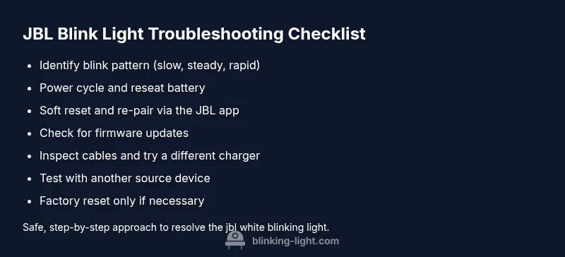 The key to moving fast is to separate pattern meaning from user actions. Start with the simplest, least invasive checks first, and only progress to firmware re-flashes or hardware inspection if the basics fail. Throughout this article, you’ll see practical, home-friendly steps that minimize risk. According to Blinking Light, sticking to a structured approach prevents missed issues and reduces frustration when handling the jbl white blinking light.