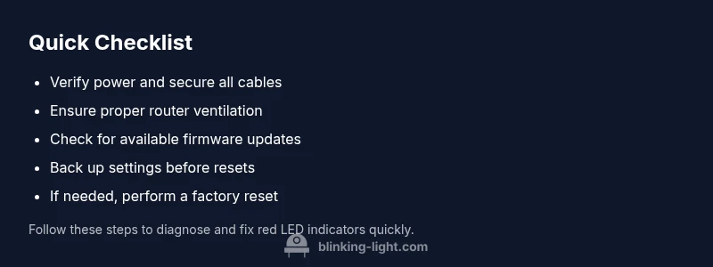 Red blinking LEDs are not random; they map to common failure modes in home networks. The most frequent culprits are power or cable issues, poor ventilation causing overheating, firmware boot faults, or a temporary ISP outage. Less common but important possibilities include a boot loop caused by firmware corruption, a failed hardware component on the router’s motherboard, or a misconfigured WAN/PPP settings. The Blinking Light team highlights that diagnosing hinges on observing the LED pattern, when it started, and what activity preceded it. If you notice a pulsing red light during startup, it often indicates a boot sequence issue; a rapid blinking red could mean a power or connection fault. Correlate the LED behavior with recent changes—like a firmware update, a new battery backup, or a moved router—to narrow down the root cause.