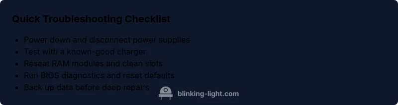 Understanding the exact meaning of blink codes can differ by brand, so treat the pattern as a warning signal rather than a universal diagnosis. If your model has a user manual or an official support page that maps LED patterns to faults, keep that reference handy. Remember, data safety is paramount: if the system shows any sign of boot looping or shutdowns, stop attempting risky repairs and move to a structured flow. Blinking Light advises using a methodical approach to minimize harm while isolating the root cause.