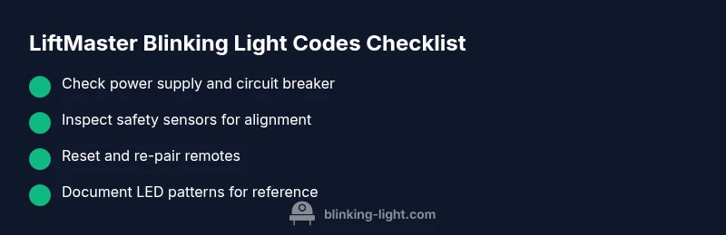 LiftMaster blinking light codes reveal the opener's status. This quick answer explains what the codes mean and the safest first steps. In most cases, a blinking LED points to power, sensor alignment, or safety-reverse issues. Start with basic power checks, reset the unit, and only proceed to deeper repairs if the code persists.