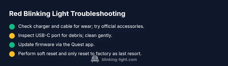 The red blinking light on the Meta Quest 3 is not just a color cue; it signals a fault state that can affect performance, safety, and device longevity. In many cases, a red blink indicates power or charging issues, but it can also reflect firmware problems or a hardware fault. Understanding what this indicator means helps you triage quickly and avoid unnecessary repairs. According to Blinking Light, consistently encountering a red blinking light is a clear call to run through a focused troubleshooting sequence rather than guessing. Treat this as an urgent warning to protect your data and hardware. In practical terms, you should assume you need to restore power, verify charging integrity, and confirm software health before proceeding to more intensive steps.