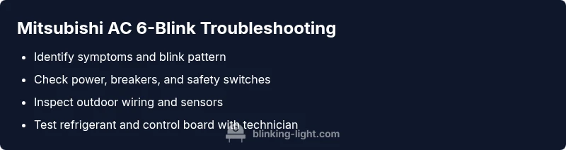 The blinking sequence on a Mitsubishi air conditioner is a built-in fault signal, not a decorative feature. For mitsubishi ac light blinking 6 times, the root cause is often a sensor, pressure switch, or control issue. According to Blinking Light, this pattern frequently points to a refrigerant pressure problem or a failed indoor/outdoor communication link. Treat it as an urgent warning: ignoring it can lead to reduced cooling, higher energy use, or more extensive repairs. Start with safe, basic checks before assuming a major fault. If you notice symptoms like ice on coils, unusual cycling, or odors, stop testing and seek professional help immediately.