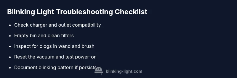 A blinking light usually signals a power, battery, filter, or sensor issue. Start with charging the battery fully, cleaning filters, and checking for blockages before pursuing deeper diagnostics.