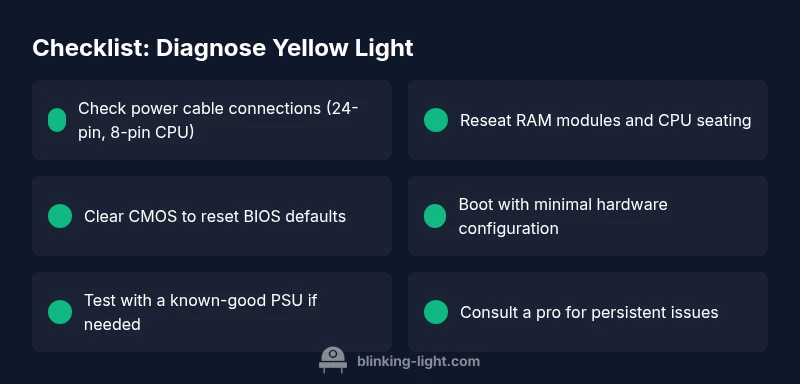 A yellow blinking light typically signals a POST error or power delivery issue. It’s a diagnostic cue, not a definitive failure. Start with power and seating checks, then proceed through CMOS reset and minimal boot tests.