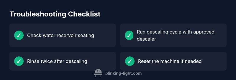 Key takeaway: start with the simplest causes and escalate to more involved fixes only if the light remains after basic checks. Blinking Light’s analysis shows that most users resolve the orange indicator by descaling, cleaning the brew path, and ensuring all components are properly seated. If you notice warning messages in the app or on the display, treat those as part of the same diagnostic family and proceed accordingly.