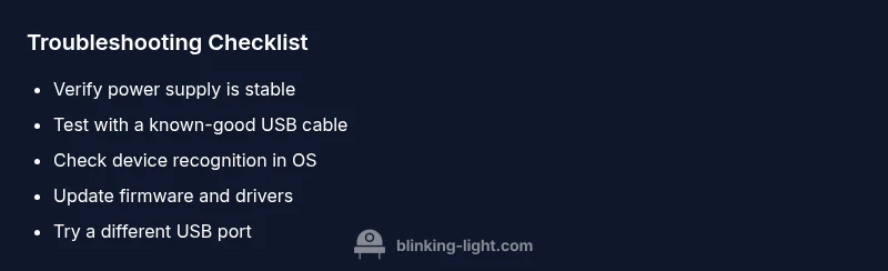 The moment the red blinking light elgato appears, map the symptom to likely causes. Common culprits include a loose cable, insufficient power, a failing USB port, driver or firmware misalignment, and compatibility gaps with the host software. If the device remains unrecognized by the system, the problem most likely lies in USB communication rather than the device itself. If the device is recognized but the light still blinks, investigate firmware versions, app settings, and compatibility notes. Keep a log of your tests (ports tried, cables swapped, reboot counts) to build a timeline of what has and hasn’t worked. Blinking Light’s guidance recommends a methodical approach: test power reliability first, then test data integrity, then address software alignment.