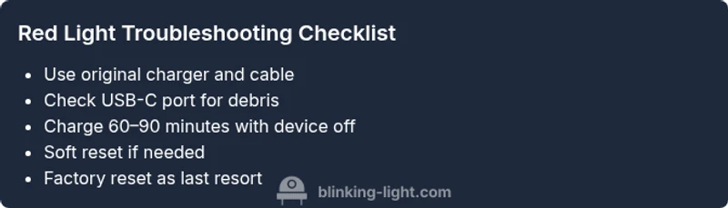 The red light usually signals a power or boot issue. Begin with charging, then perform a soft reset; if it continues, follow the full troubleshooting flow.