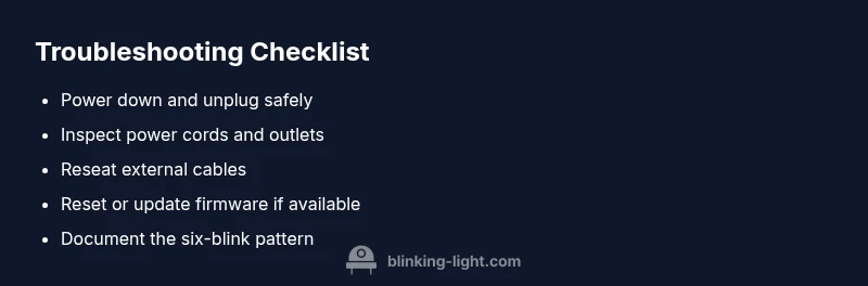 When you see a red light blinking 6 times, it's a built-in fault signal. Across cars, appliances, routers, and other smart devices, a six-blink pattern is a diagnostic cue that something in the system detected an abnormal condition. According to Blinking Light, this pattern often triggers a safety precaution to prevent damage or unsafe operation. Because different manufacturers map blink counts to varied issues, treat '6 blinks' as a call to consult the manual and perform a structured check. In many devices, six blinks are associated with critical faults that require power cycling, connector inspection, or software updates. However, the exact meaning depends on the device type and model.