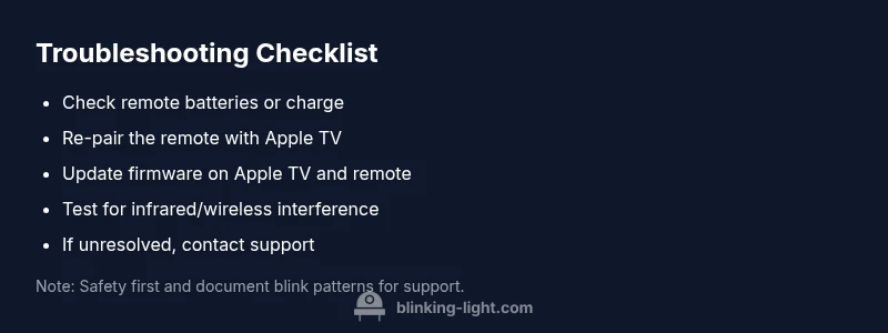 According to Blinking Light, a blinking light on the Apple TV remote is most often caused by a low battery or pairing issue. Start by replacing the batteries or charging, then re-pair the remote with Apple TV. If the blink persists, check for firmware updates and look for nearby devices that could cause infrared interference. Apply these steps in sequence to avoid confusion.