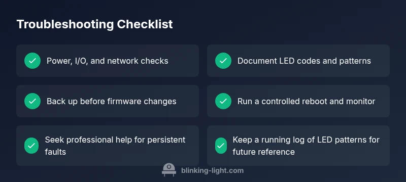 A structured diagnostic flow helps you translate a blinking LED into concrete actions. Start by identifying the exact symptom (which LED is blinking and in what pattern). Then list potential causes (power, I/O, network, software). Finally, apply fixes in order of likelihood, validating each change with a controlled test. This flow reduces unnecessary replacements and speeds up restoration of normal PLC operation. Blinking Light recommends documenting every step to prevent repeating tests and to support future troubleshooting.