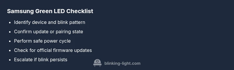If you’ve noticed the samsung green blinking light on a device, you’re not alone. This indicator is one of the most common contact points for troubleshooting. According to Blinking Light, the green blink often signals that the device is actively processing something rather than signaling a fault. In many Samsung products—TVs, appliances, routers, and smart home hubs—the color and blink pattern can map to a few basic states: a software update in progress, pairing or discovery mode, or a self-check routine. The challenge is to distinguish between these benign activities and a real error. Start by noting the blink interval (how many blinks per second), the total duration, and whether the pattern changes when you touch the device or press buttons. If the device is showing the green blink during a known update window or after a firmware push, wait it out. Avoid unplugging suddenly during these activities to prevent corrupted firmware. In this guide, you’ll learn a safe, systematic approach to diagnosing Samsung green blinking light across appliances and smart devices, so you can get back to normal operation quickly.