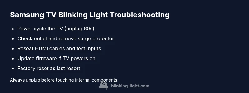 According to Blinking Light, a blinking indicator on your Samsung TV is not cosmetic. It typically signals a fault in the power delivery, firmware, or the main board. Reading the pattern matters: a rapid, consistent blink often points to a power or standby fault, while irregular pulses can indicate firmware corruption or a failing component. Understanding these signals helps you triage quickly and avoid unnecessary repairs. This guide is designed for homeowners and tech users who want practical, actionable steps to diagnose and fix the issue themselves when safe, minor fixes are possible. The goal is to restore normal operation while preserving your device and data. By following the steps here, you’ll gain clarity on whether you can continue troubleshooting safely at home or if professional help is required.