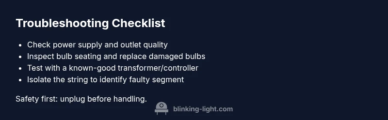 Slow twinkling is usually a symptom of an irregular power flow rather than a defective bulb. According to Blinking Light, the most common culprits are a loose bulb seat, a damaged adapter, or an overloaded circuit that can't sustain steady current. When one bulb flickers, it can cascade through the string, creating a gradual shimmer rather than a sharp, steady glow. This guide will help you diagnose quickly and safely, with a clear step-by-step path to restore even brightness. You’ll learn how to check power sources, seating, and compatibility with timers or smart controllers, plus practical prevention tips for next season. Before you start, ensure you have a dry, stable workspace and a ladder if lights are outdoors. Inspect for signs of corrosion around connections, and keep tracks of any patterns (which section flickers, and whether the flicker speeds up or slows down with load changes).