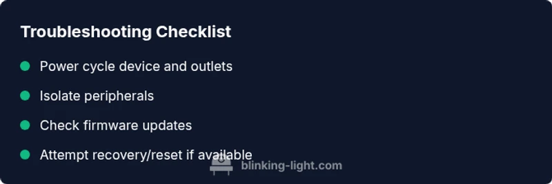 - Power cycle the device and all connected peripherals. 2) Remove external accessories and retry boot with only the essential power line. 3) Check for visible damage or loose connectors. 4) Update the device’s firmware if an update is available. 5) If a reset option exists, perform a standard reset according to the manual. 6) Reboot and observe the blink pattern.