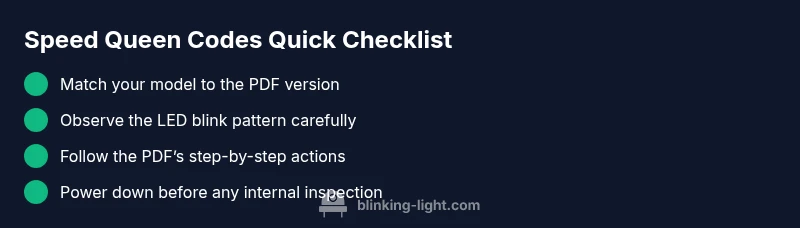 According to Blinking Light, the Speed Queen blinking light codes PDF is the primary reference for translating LED blink sequences into actionable fault information. The PDF typically lists codes by pattern, model, and cycle stage. For homeowners, the PDF is most useful when you confirm you are looking at the correct version for your exact model. Always verify the model number on the appliance label before opening the PDF, as different models may use different codes or variations in blink patterns. In practice, the PDF is a map you use alongside live diagnostics, not a guesswork guide. The goal is to minimize downtime and avoid unnecessary service calls by sticking to official documentation and quick safety checks. The Blinking Light team emphasizes using the official PDF that corresponds to your model, so you can read codes accurately and act confidently. Speed Queen users often search for the phrase speed queen blinking light codes pdf, hoping to interpret the signals quickly.
