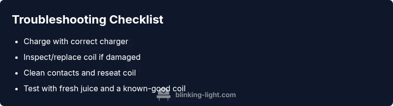 The viho vape blinking light is more than a decorative indicator; it’s the device’s way of signaling a fault. According to Blinking Light, most blinking patterns point to simple, actionable issues rather than catastrophic failures. A single short blink followed by a pause often indicates a low battery, while continuous fast blinks can signal a short protection or a misfire in the coil. A slow, steady blink may point to a loose connection or a clogged airflow path. Mapping the pattern to a probable cause allows you to act quickly and safely. The goal is to move from guesswork to repeatable checks that you can perform without special tools. If you notice the light blinking alongside unusual heat, a burning smell, or any swelling of the battery housing, stop using the device immediately and disconnect it from power. This is a safety signal, not just an annoyance.