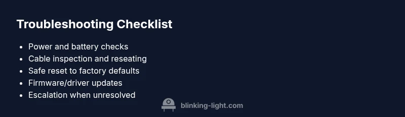 Keep this handy checklist in mind whenever you encounter a blinking indicator. Start with the simplest fix: verify the power source and replace batteries if needed, then perform a standard reset according to the manual. Inspect all cables and connectors for looseness, damage, or corrosion, and reseat or replace as necessary. If the blink continues, test with a known-good power supply or battery, and confirm the device isn’t overheating. Check for firmware or driver updates; apply them if available and compatible. If you’re troubleshooting a network device, reboot the router and recheck the connection status. Document the blink pattern and timing; this helps you or a technician identify patterns over time. Finally, if none of these steps resolve the issue, contact the product support line or schedule a professional assessment. Keeping a simple log can prevent future outages and crosstalk between devices.