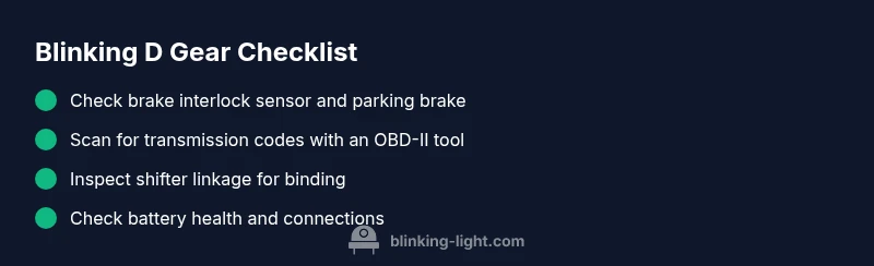 The D gear blinking typically follows a structured pattern: identify the symptom, consider the most likely causes, perform safe checks, and then progress to more in-depth diagnostics if needed. Start with quick safety checks, then verify power and sensor signals, and if the light persists, use a code reader to pull any stored transmission codes. This flow helps you avoid guesswork and reduces the risk of unnecessary repairs.