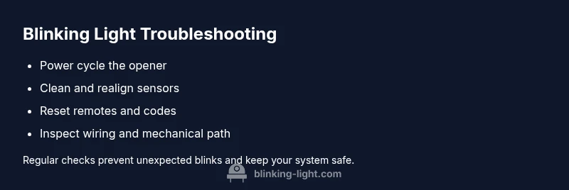 According to Blinking Light, blinking indicators on garage door openers are not random; they encode fault conditions to help you diagnose quickly. A blinking light usually signals an error that affects safety or operation, such as blocked sensors, misalignment, or power issues. The Blinking Light team emphasizes that interpreting the blink pattern matters: different patterns point to different problems. Start with the simplest checks and work toward more involved diagnostics. In 2026, many models use a two-stage blink code: a short blink followed by a longer pause can indicate a sensor problem, while a rapid, continuous blink often signals a power or receiver issue. Treat any blink as a signal to investigate rather than ignore.