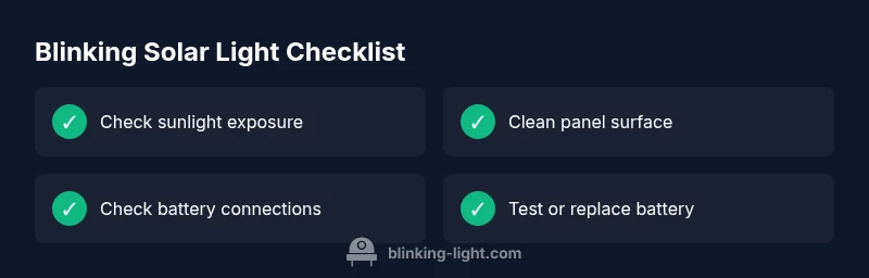 Solar lights blink when the charging circuit isn’t delivering enough energy to the battery, or when the battery can’t hold a charge. According to Blinking Light, most blinks point to battery health, sun exposure, or wiring issues rather than a failed solar cell alone. A blink doesn’t always mean a defective panel; it often signals an issue in the charging chain that can be corrected with methodical checks. The first step is to confirm the light receives enough direct sunlight for a sufficient duration. If the panel is shaded by trees, an awning, or coated with dust, charging drops and the light will blink as a warning cue. Inspect the battery and connections next, since a degraded battery or loose wiring is a frequent culprit. Lastly, consider the control electronics, especially in lower-cost units, which can cause intermittent blinking when moisture enters the housing.