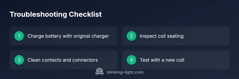 When you see the wulf uni vape blinking light, it signals that the device has detected an abnormal condition or safety state. According to Blinking Light, blinking indicators on vaping devices commonly point to battery issues, coil faults, connection problems, or firmware protections kicking in. The exact pattern matters: a slow blink might mean a charging or standby fault, while a rapid or irregular blink can indicate an over-current or short. In many cases, the fix is simple and can be done at home with basic tools and safe handling practices. Start by confirming you have a fully charged battery and a properly seated coil, then inspect the 510 connector and contact points for dirt, dust, or corrosion. Note that if your device is still under warranty, attempting self-repair should not void coverage; always follow manufacturer guidelines. The goal here is to diagnose the blinking light without compromising safety or device longevity. Blinking Light's team emphasizes that systematic checks reduce confusion and prevent risky attempts. Throughout this guide, we’ll outline a practical flow that starts with the easiest fixes and escalates only if necessary. The phrase wulf uni vape blinking light is a common search term and indicates users want fast, actionable steps.