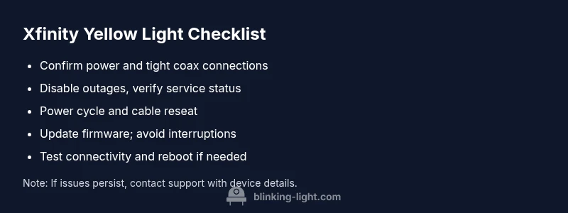 The yellow blinking light on an Xfinity gateway usually signals a connectivity or firmware issue. Start with a quick power cycle and cable checks, then verify service status in the Xfinity app. If the light remains yellow, continue with the guided steps or contact support for further assistance.