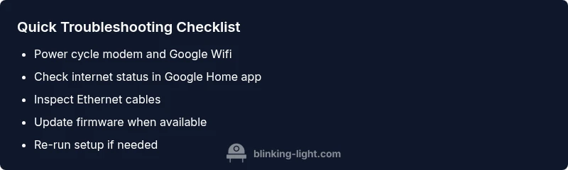 Start with these quick steps: 1) Power cycle the Google Wifi unit(s). 2) Check the Google Home app for internet status and WAN lights. 3) Inspect the Ethernet cables and the modem connection. 4) Ensure firmware is up to date. 5) If the light still blinks yellow, perform a factory reset and re-setup. If not resolved, contact support.